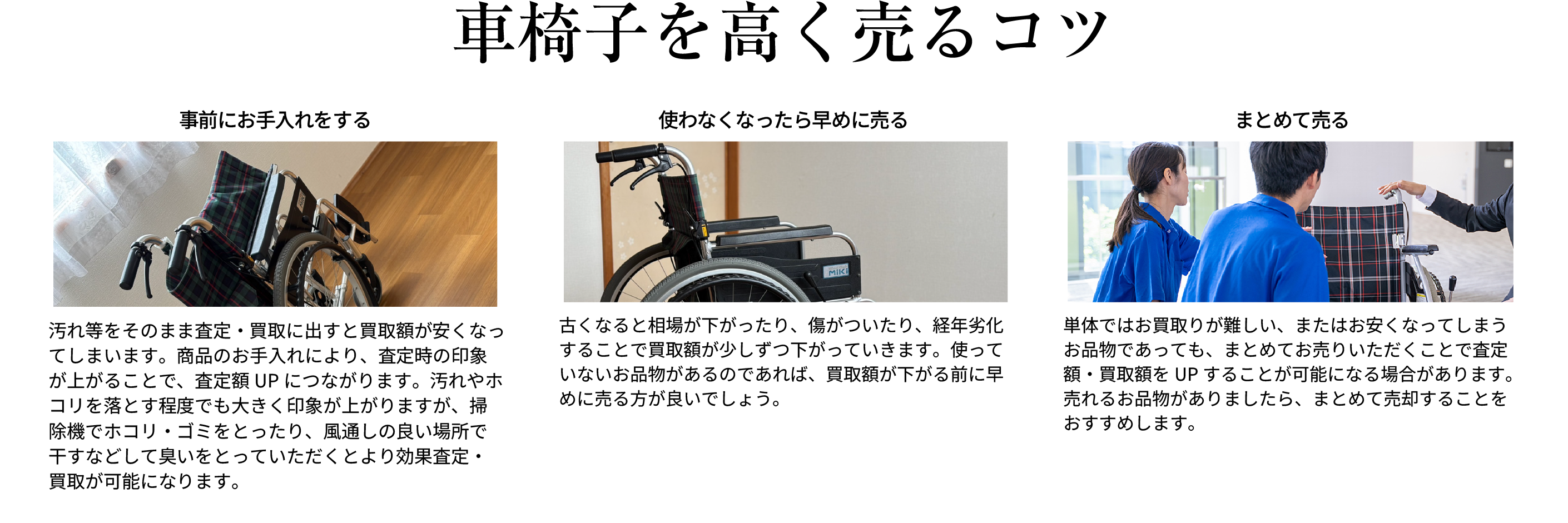 大切な方がご利用されていた車椅子を価値あるものとして次の世代へつなぎます。その場で無料査定 高価買取いたします お手持ちの車椅子を整理したい方 早急に現金化したい方 遺品整理でお困りの方 手間も費用もゼロ 出張&店頭買取無料